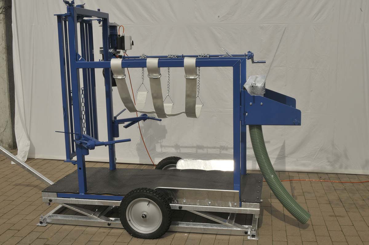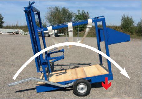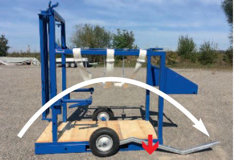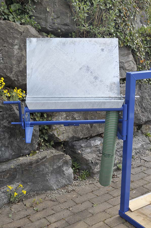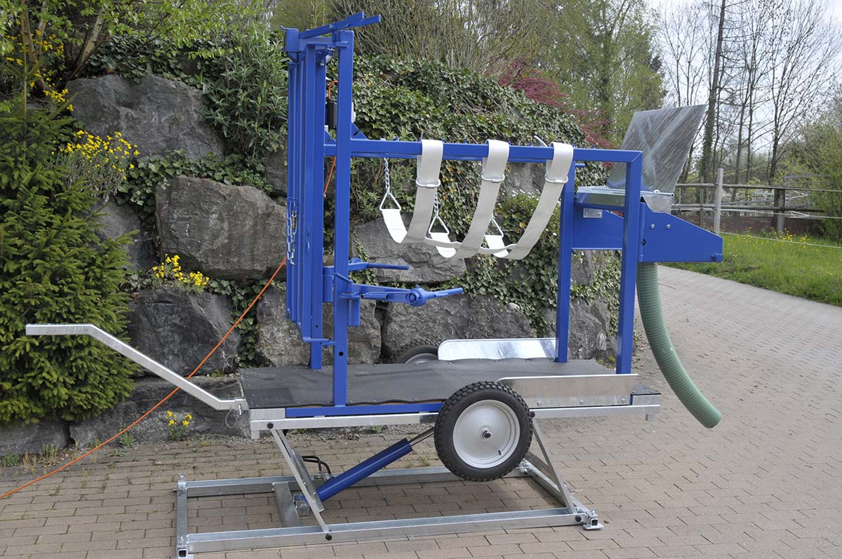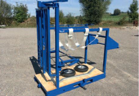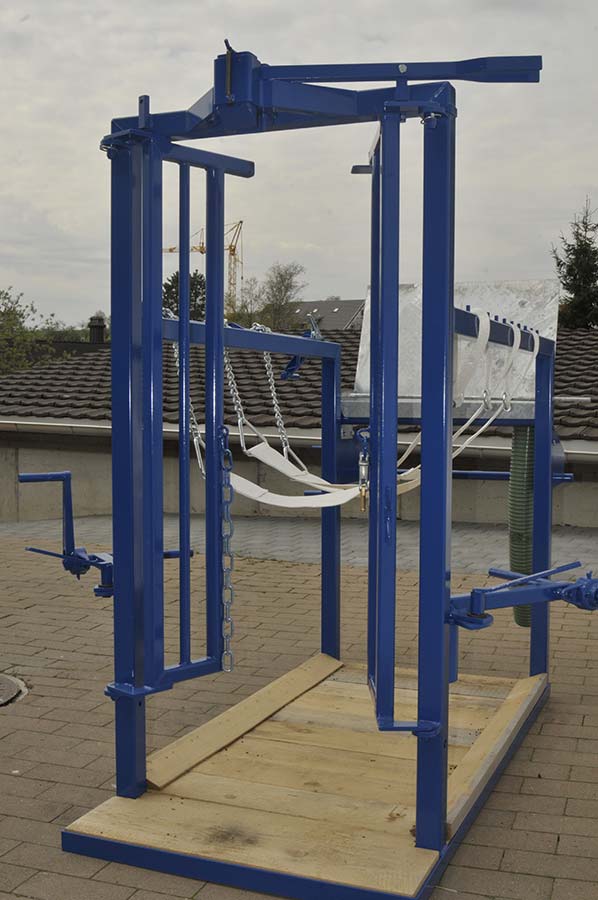 Für die Arbeit kann der Klauenpflegestand mit einer Wippe (von einer Person alleine) auf den Unterboden abgesenkt werden. Die Räder können ebenfalls mit wenigen Handgriffen demontiert/montiert werden.