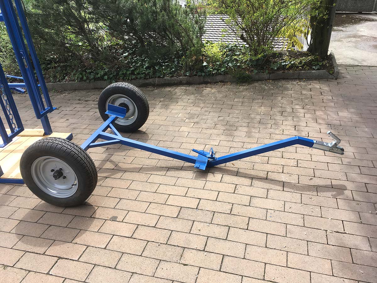 Dieses Angebot besteht aus einem Fahrgestell mit Auto-Räder und Ausrüstung für die Strasse (Lichtanlage, Rückstrahler, Abreissseil, Typenschild).